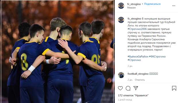 Юношеская команда футбольного клуба «Строгино» 2006 года рождения успешно выступила в Клубной Лиге, заняв третью строчку. Это позволило ребятам выйти на Первенство России. Об этом сообщили сотрудники спортивного учреждения.